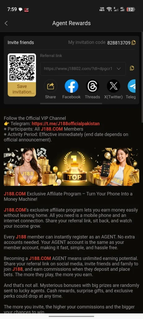 Visit the invite and referral program section from their click on the invite button. From their copy invite code or copy your game link. In addition go to your referral platform and share the link with your friends like Facebook, WhatsApp and telegram. Moreover one a friend join through your link you will receive bonuses, rewards and commissions from their deposits and gameplay.